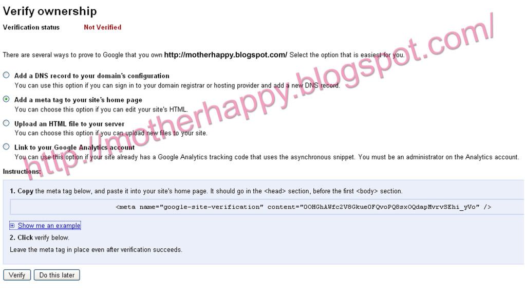 Kembali ke halaman google webmaster tool. kemudian klik tombol Verify, untuk mengkonfirmasi pendaftaran.