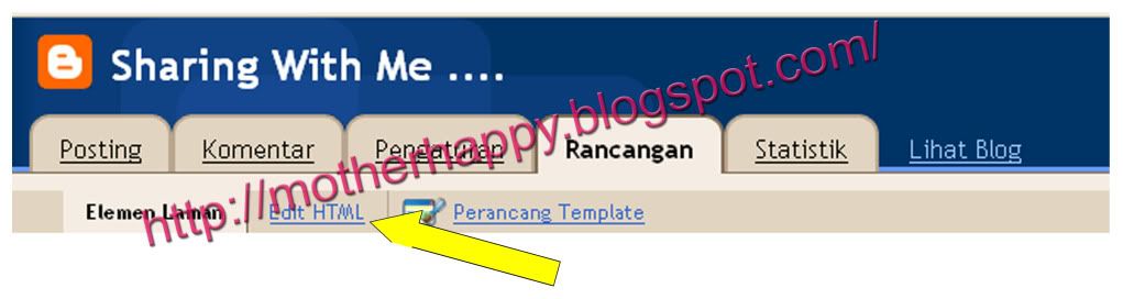 Klik gambar untuk memperbesarMasuk ke Blog anda kemudian dalam halaman Template, pilih tab Edit Html