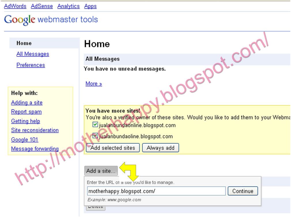 Klik Add a site kemudian isi dengan alamat Blog/Web kita tanpa di awali dengan http:// atau www