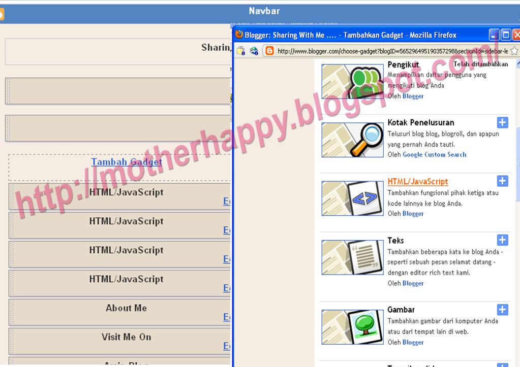 Masuk ke Blog anda kemudian dalam halaman Template/Elemen Halaman, pilih Add Gadget/Tambah Gadget